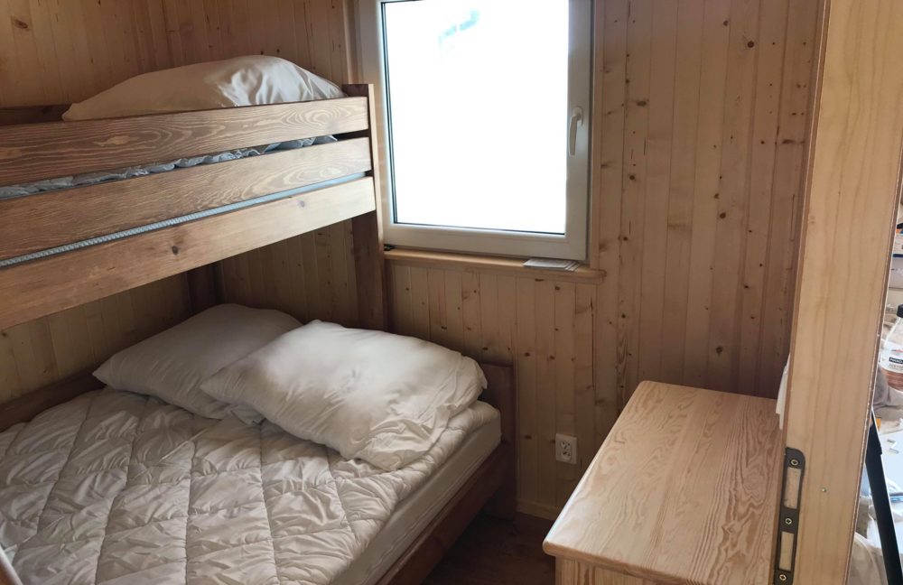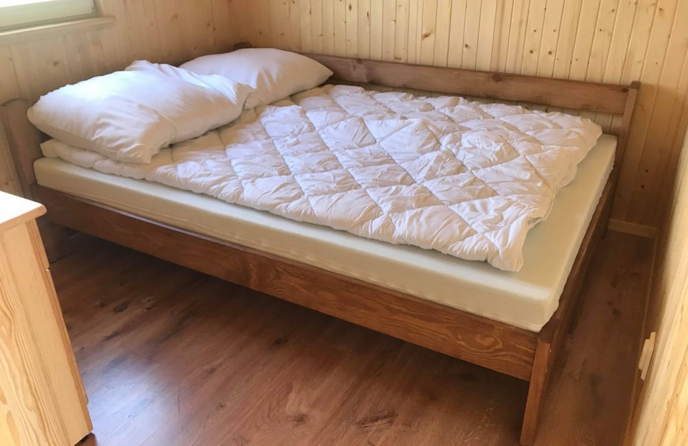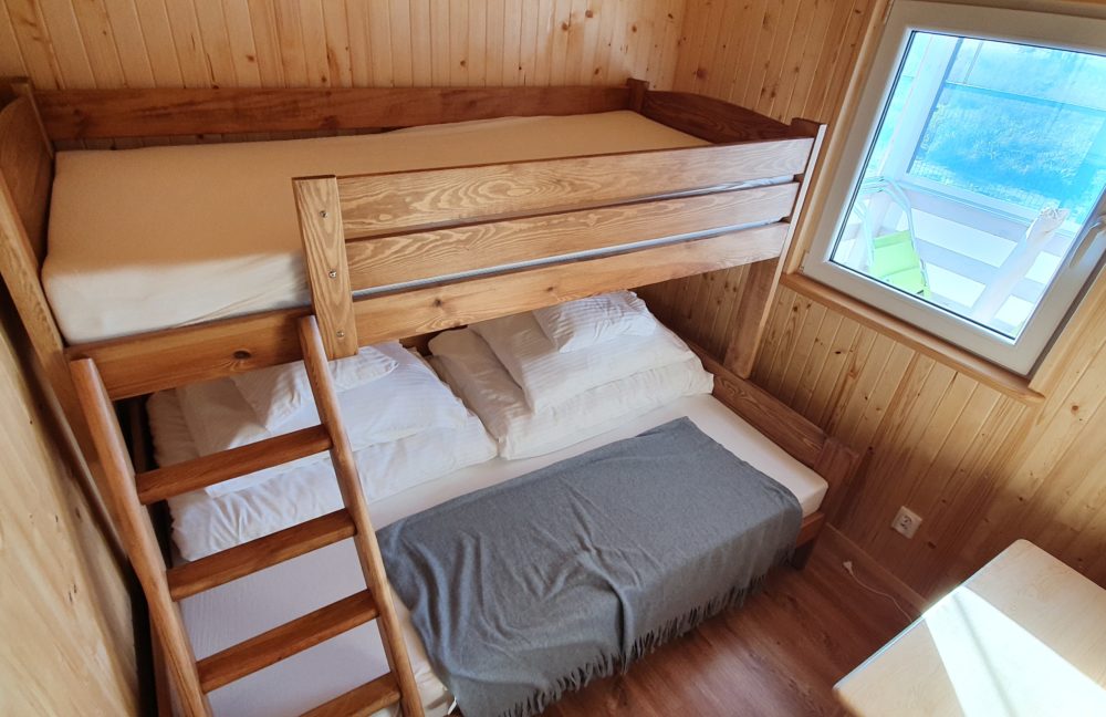Sypialnie: – 1) łóżko małżeńskie, 2) łóżko piętrowe: 1-osobowe (u góry) + 2-osobowe (na dole), komoda, lampka nocna w obu sypialniach.