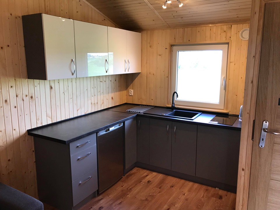 Aneks kuchenny: lodówka, płyta ceramiczna, komplet garnków, naczynia, sztućce, czajnik elektryczny